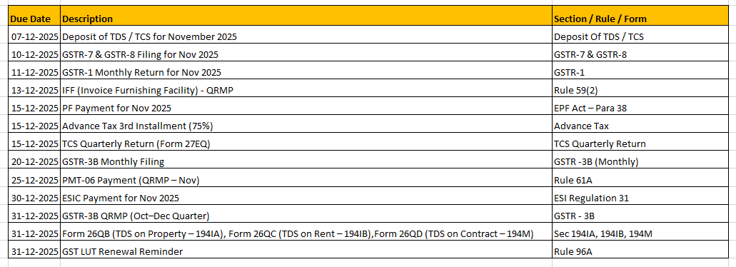 Due Dates for Month of Dec 2025