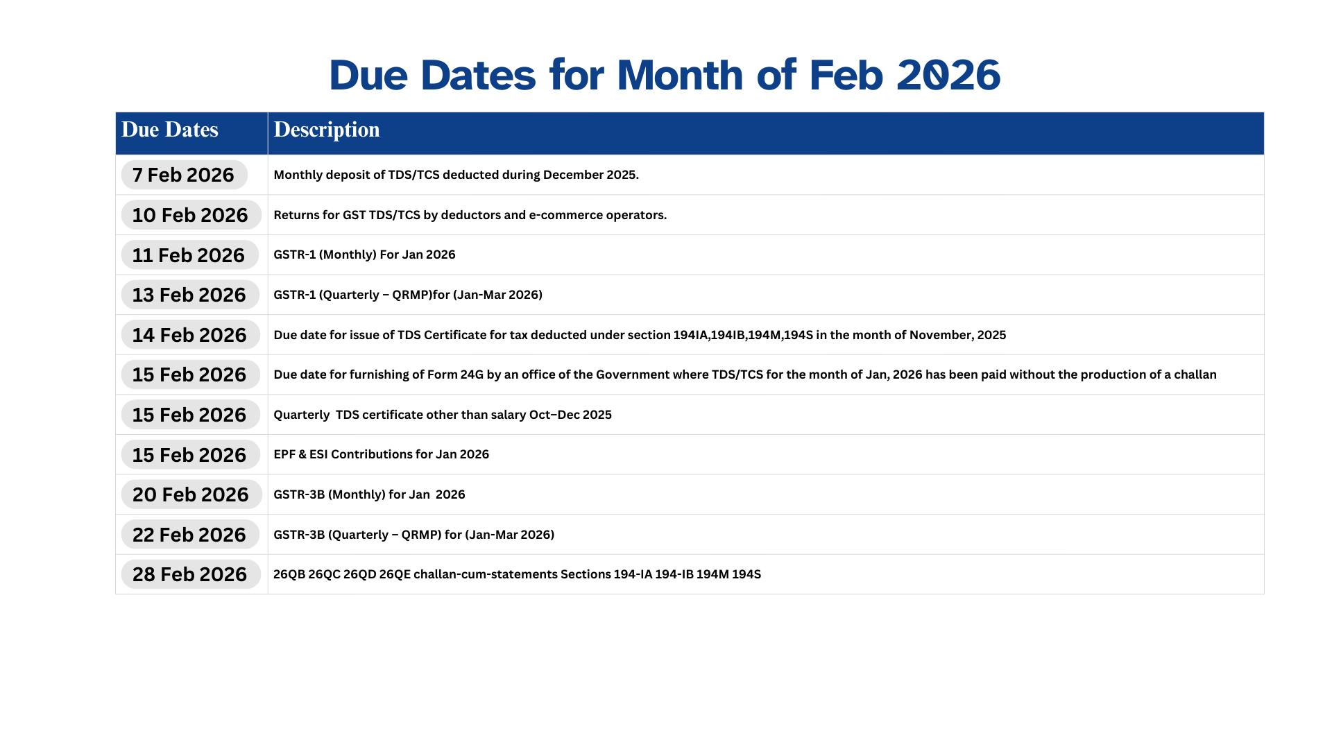 14th April - Deadline to issue Form 16B (TDS Certificate) for property purchase TDS (Feb) under Section 194-IA, & Deadline to issue Form 16C (TDS Certificate) for rent above Rs. 50,000/month under Section 194-IB (if lease ended in Feb), & Deadline to issue Form 16D (TDS Certificate) for payments under Section 194M (Feb), & Deadline to issue Form 16E (TDS Certificate) for TDS on Virtual Digital Assets (Feb) under Section 194S.
