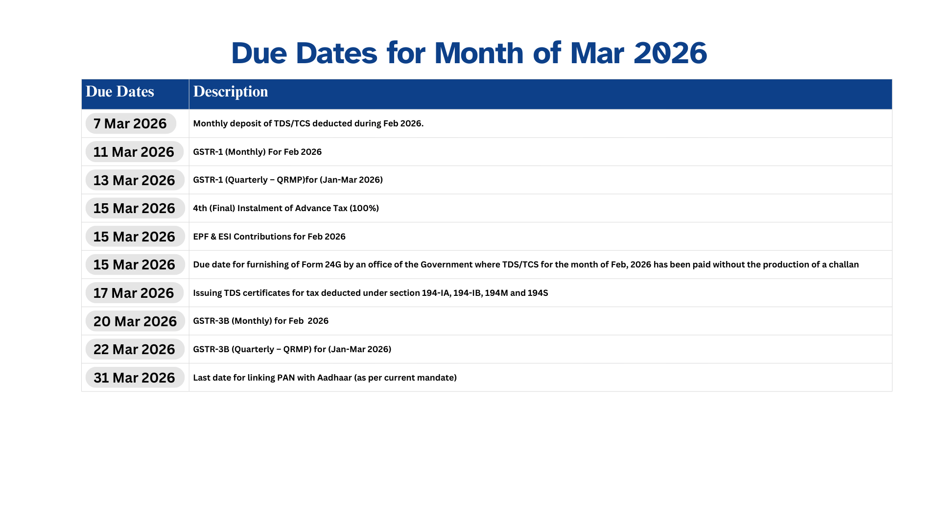 11th April - Deadline to file GSTR-1 (Monthly) for March Outward Supplies.