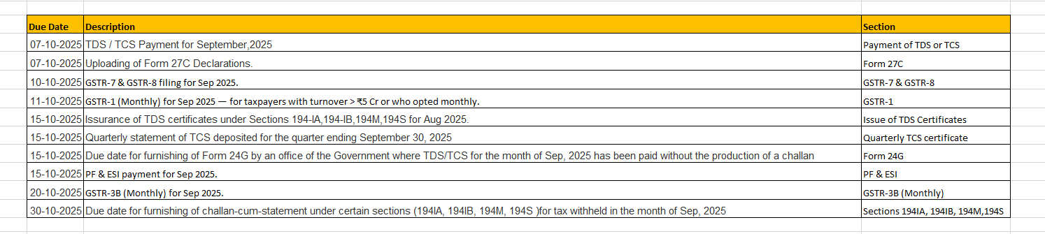 Due Dates for Month of Oct 2025