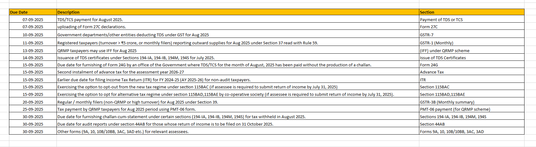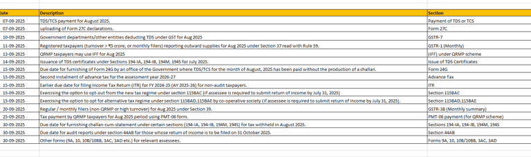 Due Dates for Month of Sep 2025