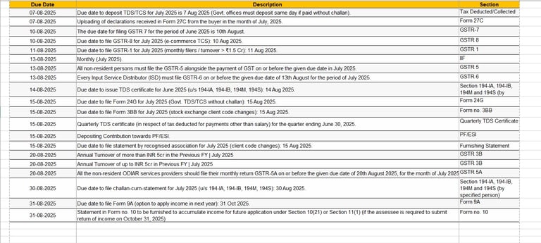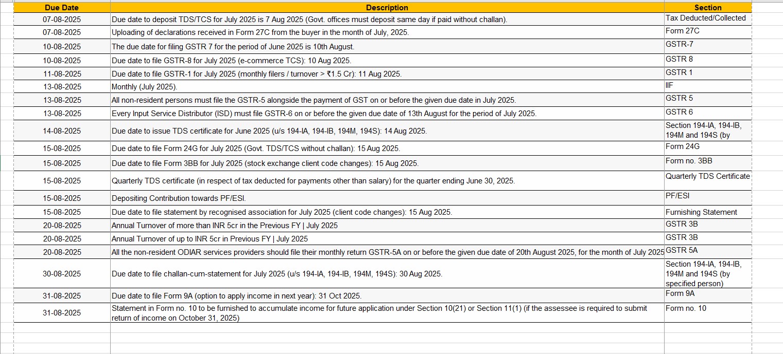 Due Dates for Month of Aug 2025