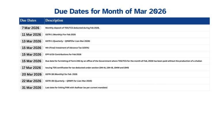 15-Mar 2025 – Advance Tax (4th Installment for FY 2024-25) (Applicable to all taxpayers liable for advance tax)